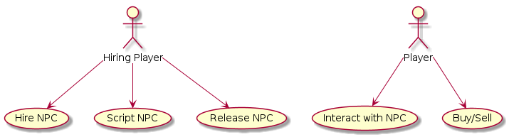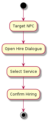 Player target npc and enter "/hire" or selecting the hire icon from the context menu (See Context Menu Design). This open the hire NPC dialogue where the user can select tasks and see the price for each service. Select the needed service and confirm hiring of the NPC.