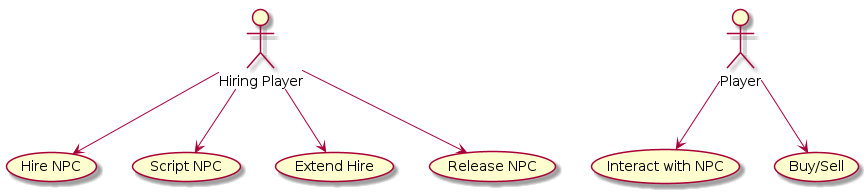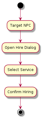 Player target npc and enter "/hire" or selecting the hire icon from the context menu (See Context Menu Design). This open the hire NPC dialog where the user can select tasks and see the price for each service. Select the needed service and confirm hiring of the NPC.