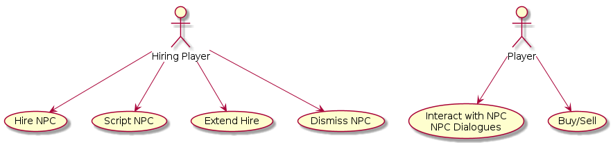 Player target npc and enter "/hire" or selecting the hire icon from the context menu (See Context Menu Design). This open the hire NPC dialog where the user can select tasks and see the price for each service. Select the needed service and confirm hiring of the NPC.