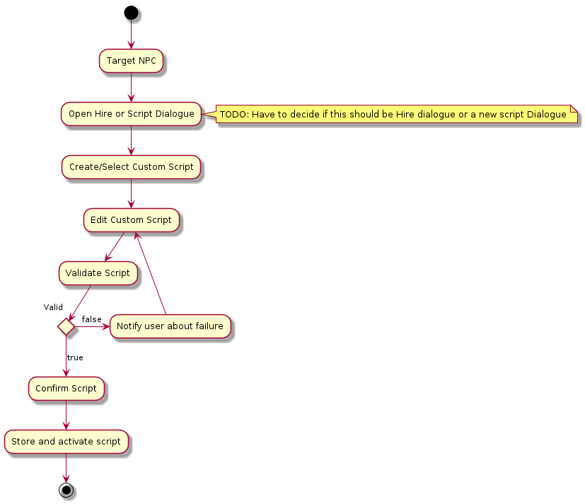 Hired NPCs can be scripted. User open the script window or hire dialogue to enter new scripts for the NPC.