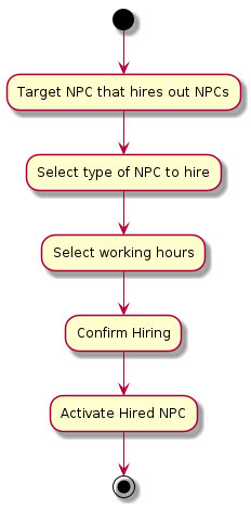 Either using the command "/hire" or selecting the Hire Icon from the Context Menu (See Context Menu Design). This open the Hire NPC Dialog. From the Hire NPC Dialog the hiring player can do the following: