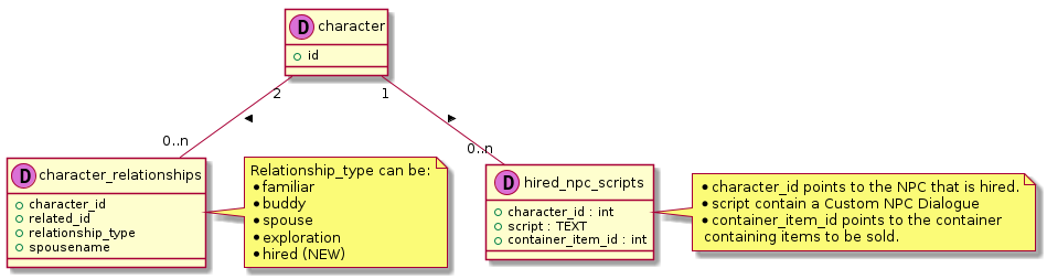 To keep track of hired NPCs and store the scripts a few new elements will be needed in the DB. The character relationships record keep track of relationships between characters so extending with a new hired type should cover the need for this system. Scripts has to be stored somewhere. A new hired_npc_scripts record will be created to store the Custom NPC Dialogues.
