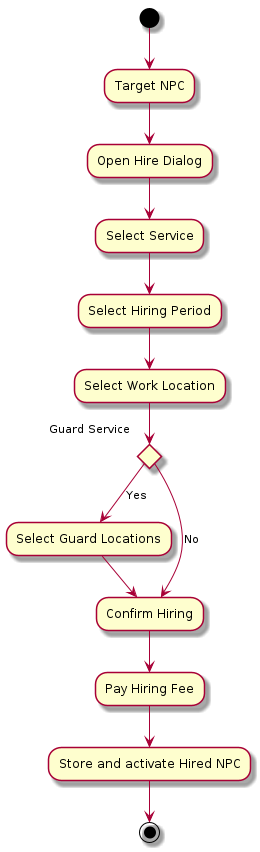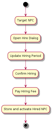 Player target npc and enter "/hire" or selecting the Hire Icon from the Context Menu (See Context Menu Design). This open the Hire NPC Dialog where the user can: