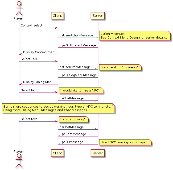 Through NPC Dialogues the player can select type of NPC to hire. Merchant Player will only be available if the player meet a set of requirements Example: Level in crafting.