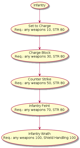 - Infantry Wrath [Common with Shield Mastery style: Fence your opponent weapon off with your shield then jump hit him with the weapon. Stun for few second and high slash/blunt/pierce damage with jumped movement. Very fast moove, unblockable.